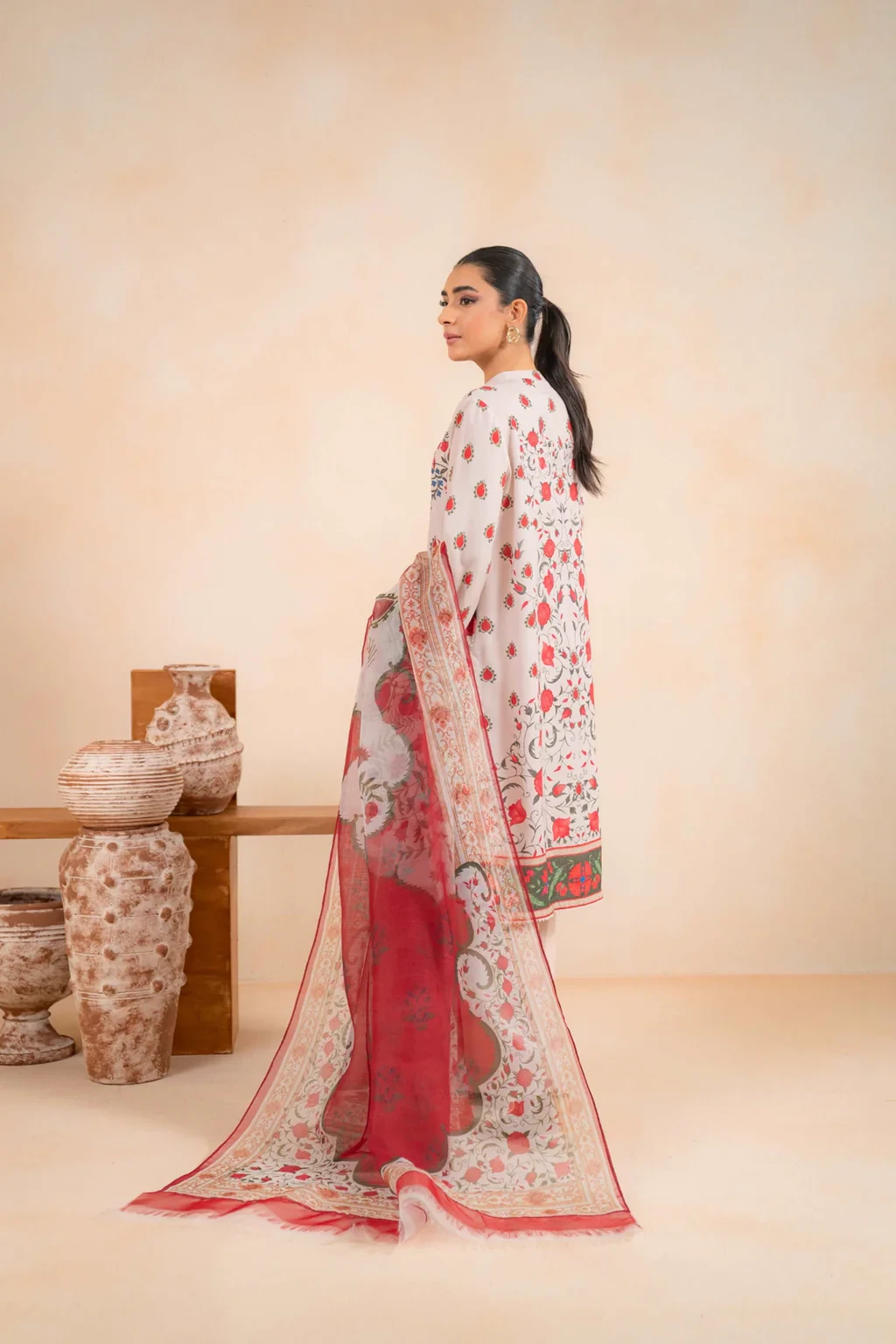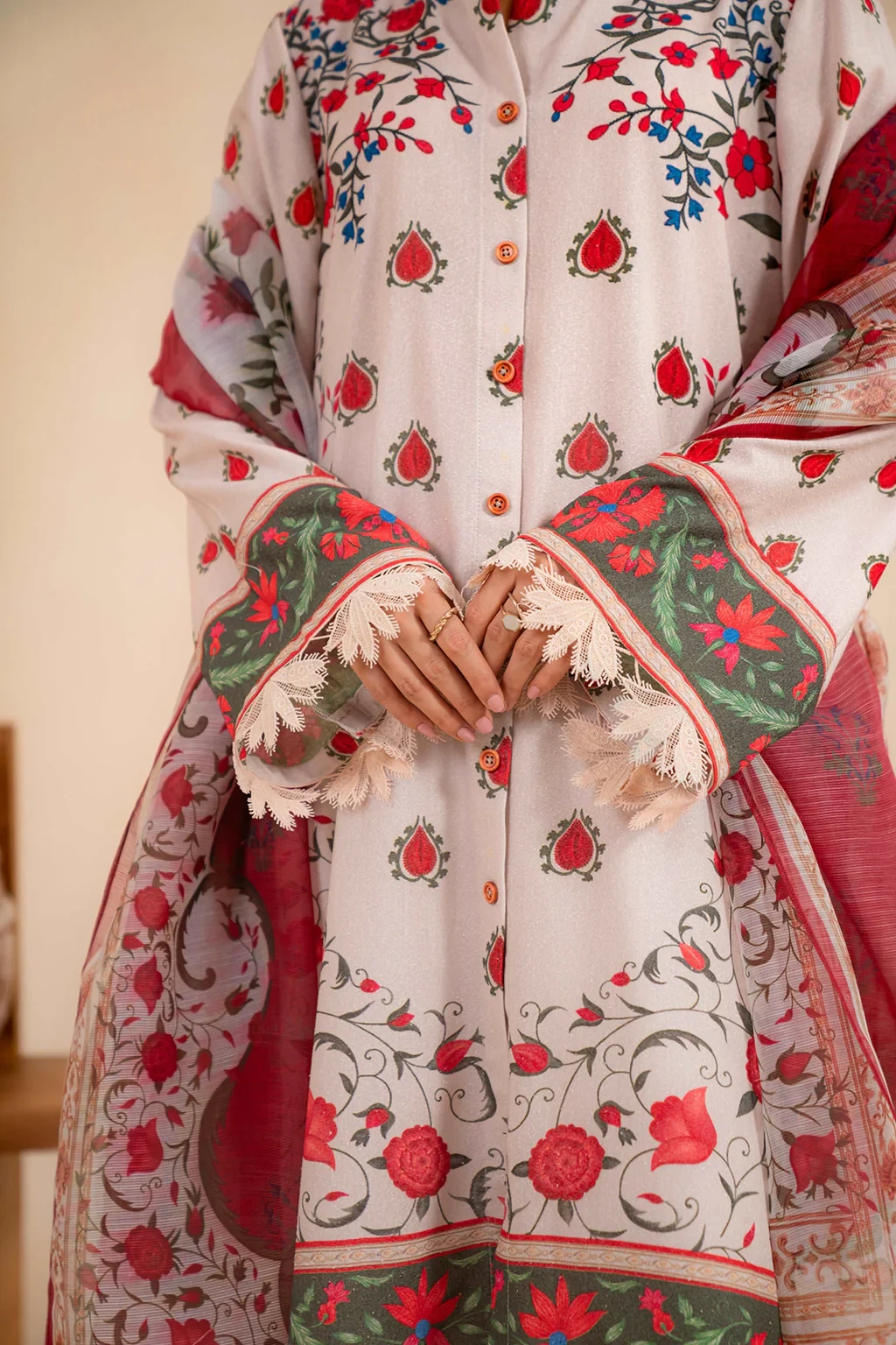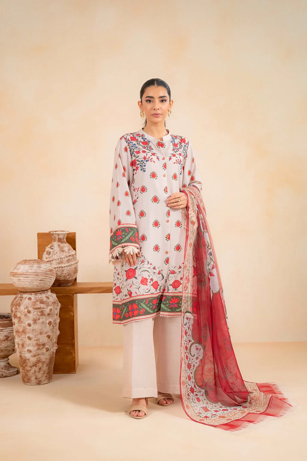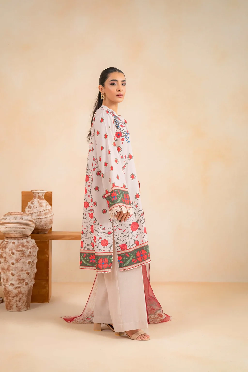 This 3 piece suit combines a stunning printed shirt with borders on both shirt, sleeves and dupatta making a chic statement combined with dyed trousers all in breathable karandi fabric