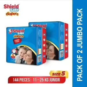 Pack of 2 Shield Baby Diapers Size 5 XLarge (11-25Kg), Jumbo Pack 72 Count