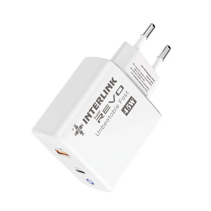- Power: 45W Fast Charging - Ports: USB Type-A + Type-C - Input: 110–240V ~ 50/60Hz - Output: 5V/3.1A, 9V/2.1A, 12V/1.5A - Cable: 66W Type-C to Type-C Included - Compatibility: iPhone, Samsung, Huawei, Laptop & MacBook
