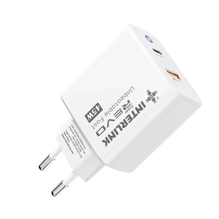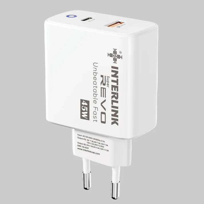 - Power: 45W Fast Charging - Ports: USB Type-A + Type-C - Input: 110–240V ~ 50/60Hz - Output: 5V/3.1A, 9V/2.1A, 12V/1.5A - Cable: 66W Type-C to Type-C Included - Compatibility: iPhone, Samsung, Huawei, Laptop & MacBook